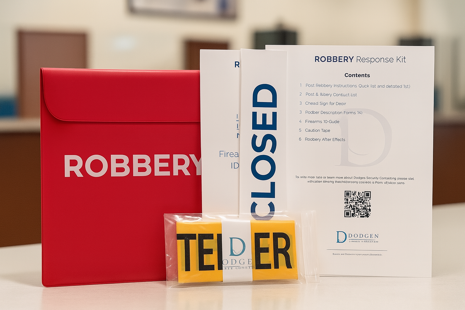 A comprehensive, ready-to-deploy Robbery Response Kit designed by Dodgen Security Consulting. Includes essential post-robbery tools such as step-by-step instructions, robber description forms, closed signage, a firearms identification guide, and more. Trusted by financial institutions and tailored for immediate crisis response. For orders over 50 kits or customizations, please contact us. For branding customizations please complete…